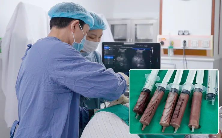 Ở lần can thiệp thứ nhất, bác sĩ hút ra khoảng 70ml dịch mủ đục màu nâu nhạt từ hai khoang dịch. Kết quả cấy vi sinh xác định tác nhân gây bệnh là vi khuẩn Klebsiella pneumoniae. Trên cơ sở này, bác sĩ đã điều chỉnh phác đồ kháng sinh nhằm tối ưu hiệu quả điều trị.