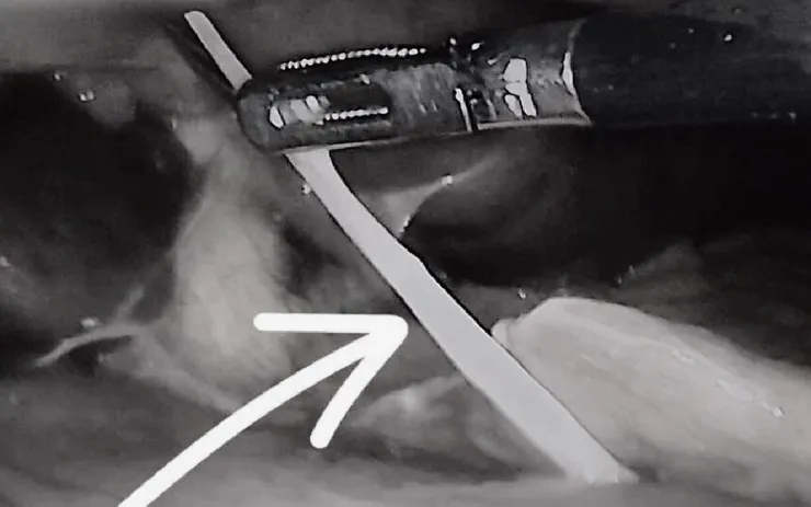 Người bệnh được chỉ định phẫu thuật nội soi. Trong mổ, ekip phát hiện ổ áp xe cạnh sau manh tràng, mô viêm dính phức tạp. Khi mở ổ mủ, các bác sĩ ghi nhận dị vật dài khoảng 3cm - nghi xương cá đã đâm xuyên thành ruột thừa gây thủng. Sau đó, dị vật được lấy ra, ruột thừa được cắt bỏ và đặt dẫn lưu ổ áp xe.