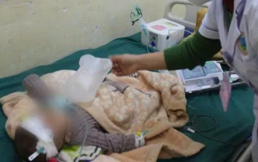 Trước khi nhập viện, trẻ sốt cao, phát ban toàn thân, quấy khóc nhiều, sau đó khó thở tăng dần. Gia đình tự điều trị tại nhà nhưng không cải thiện nên đưa trẻ đến cơ sở y tế và được chuyển tuyến lên bệnh viện tỉnh. Khi tiếp nhận, bệnh nhi lơ mơ, kích thích, sốt cao, ban dạng sởi lan khắp cơ thể, ho nhiều. Trẻ thở nhanh, thở ậm ạch, tim nhanh 180 lần/phút; SpO2 chỉ đạt 75% khi không hỗ trợ oxy, cho thấy tình trạng thiếu oxy máu nặng.