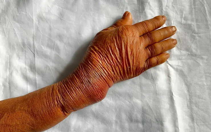Khi vào viện, cổ tay bệnh nhân bầm tím, đau chói, trục xương lệch rõ rệt. Đáng chú ý, ổ mủ ở cổ tay đang vỡ, cho thấy tình trạng nhiễm trùng phần mềm nặng do bó lá thuốc không đảm bảo vệ sinh. Việc vận động cổ tay cũng bị hạn chế đáng kể, đe dọa chức năng lâu dài của chi thể - đặc biệt ở người cao tuổi có sức đề kháng kém.