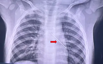 Tại bệnh viện địa phương, X-quang ngực ghi nhận dị vật kim loại trong đường thở. Sau sơ cứu ban đầu, bệnh nhi được chuyển khẩn cấp lên tuyến trên.
