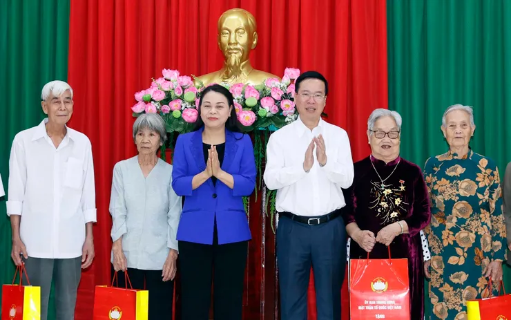Chủ tịch nước Võ Văn Thưởng chúc Tết các đối tượng chính sách huyện Trà Ôn, tỉnh Vĩnh Long. (Ảnh: TTXVN)