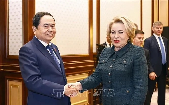 Chủ tịch Quốc hội Trần Thanh Mẫn vui mừng gặp lại Chủ tịch Hội đồng Liên bang Nga Valentina Matviyenko và trân trọng chuyển lời thăm hỏi của Tổng Bí thư Tô Lâm, Chủ tịch nước Lương Cường, Thủ tướng Chính phủ Phạm Minh Chính và cá nhân Chủ tịch Quốc hội tới Tổng thống Vladimir Putin, Thủ tướng Mikhail Mishustin, Chủ tịch Duma Quốc gia (Hạ viện) Nga Vyacheslav Volodin và cá nhân Chủ tịch Hội đồng Liên bang Nga.