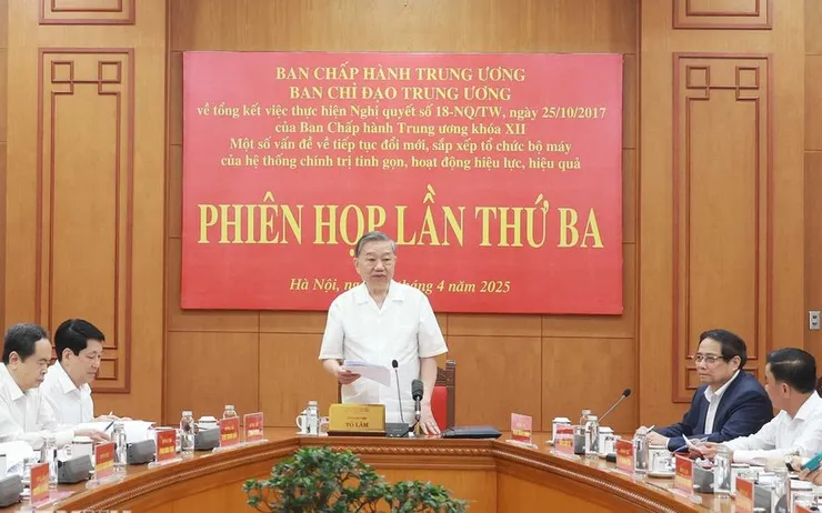 Ngày 14/4, tại Trụ sở Trung ương Đảng, Ban Chỉ đạo Trung ương về tổng kết việc thực hiện Nghị quyết số 18-NQ/TW, ngày 25/10/2017, của Ban Chấp hành Trung ương Đảng khóa XII "Một số vấn đề về tiếp tục đổi mới, sắp xếp tổ chức bộ máy của hệ thống chính trị tinh gọn, hoạt động hiệu lực, hiệu quả" (Ban Chỉ đạo) đã tổ chức Phiên họp lần thứ 3 để thảo luận, thông qua Kế hoạch của Ban Chỉ đạo về việc thực hiện sắp xếp, sáp nhập đơn vị hành chính cấp tỉnh, cấp xã và xây dựng hệ thống chính trị 2 cấp ở địa phương.Tổng Bí thư Tô Lâm, Trưởng Ban Chỉ đạo chủ trì Phiên họp.