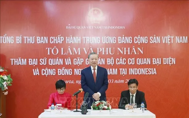Tại cuộc gặp, Tổng Bí thư Tô Lâm bày tỏ niềm vui, xúc động trước bầu không khí đầm ấm và thắm tình quê hương, ân cần thăm hỏi bà con, cán bộ, nhân viên Đại sứ quán, Phái đoàn đại diện thường trực Việt Nam tại ASEAN, cùng đại diện cộng đồng, doanh nghiệp và lưu học sinh Việt Nam tại Indonesia. Tổng Bí thư Tô Lâm nhấn mạnh chuyến thăm Indonesia lần này có ý nghĩa đặc biệt, diễn ra trong bối cảnh tròn 70 năm thiết lập quan hệ ngoại giao giữa hai nước (1955-2025), 30 năm Việt Nam gia nhập ASEAN, cả hai nước đều kỷ niệm 80 năm ngày thành lập nước, là những sự kiện quan trọng góp phần thắt chặt thêm mối quan hệ hữu nghị truyền thống đã được lãnh đạo Đảng, Nhà nước và nhân dân hai nước, trong đó có cộng đồng người Việt Nam tại Indonesia dày công vun đắp.