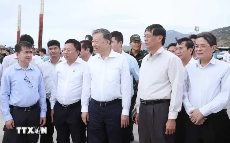 Tổng Bí thư Tô Lâm kiểm tra thực địa Cảng biển tổng hợp Cà Ná, xã Phước Diêm, huyện Thuận Nam, tỉnh Ninh Thuận. (Ảnh: TTXVN)