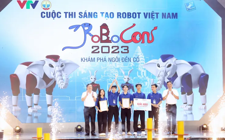 Các thành viên của DCN - ĐT 02 nhận giải thưởng cho đội đại diện Việt Nam tham dự ABU Robocon 2023