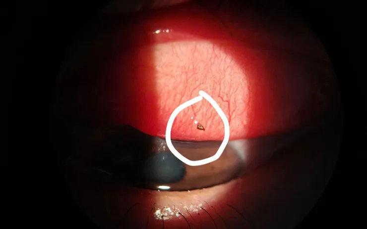 Bệnh nhân nam, 37 tuổi, đến Bệnh viện Mắt Ninh Bình trong tình trạng cộm, nhức và chảy nước mắt sau khi xây nhà. Khám ban đầu cho thấy giác mạc bị xước, bắt màu fluorescein dương tính. Khi lộn mi trên, bác sĩ phát hiện một mạt sắt nhỏ găm vào kết mạc trên.