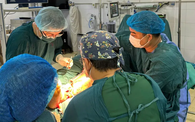 Ekip bác sĩ Khoa Ngoại Chấn thương - Chỉnh hình - Bỏng phối hợp với Khoa Gây mê Hồi sức đã tiến hành phẫu thuật cấp cứu nối phần cẳng chân gần đứt rời cho bệnh nhân. Ca mổ kéo dài gần 4 giờ, yêu cầu kỹ thuật tỉ mỉ nhằm khôi phục hệ thống mạch máu, thần kinh và xương bị tổn thương nặng.