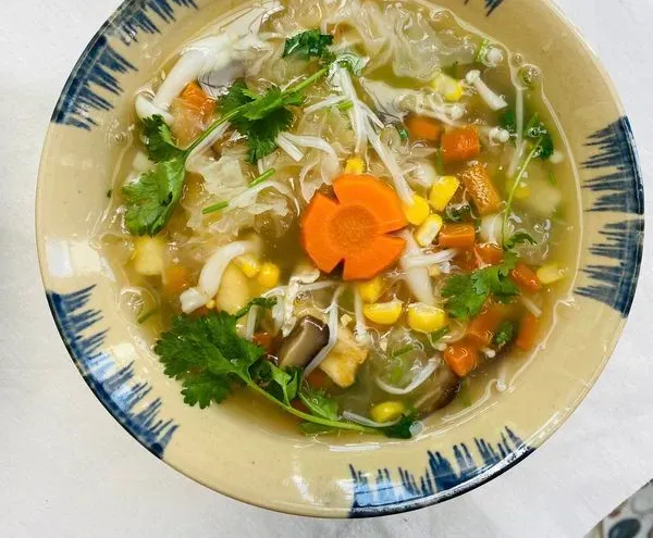- Hạt sen, cà rốt, bắp Mỹ hầm với nước dừa tươi trong 30 phút cho các hạt chín mềm. Sau đó cho nấm linh chi, nấm hương và nấm kim châm vào và khuấy đều.