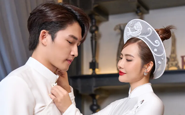 Diện trang phục áo dài cưới, cặp đôi Đình Tú, Phan Minh Huyền dành cho nhau cái nhìn trìu mến. Khả năng diễn xuất tái hiện hình ảnh "cậu - mợ" trong Thương ngày nắng về cùng cái hôn bất ngờ lên trán của Đình Tú dành cho Phan Minh Huyền chiếm trọn tình cảm của khán giả.