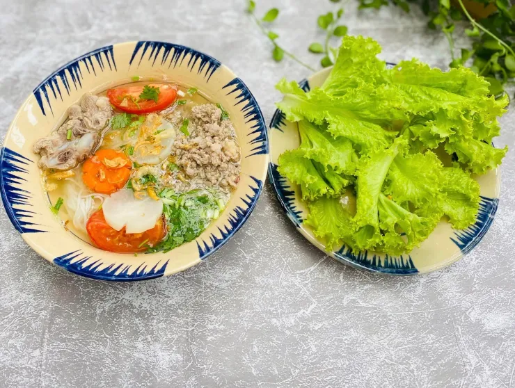 Đến đây là món bún đã sắp được hoàn thành rồi đó. Cho bún vào tô rồi múc sườn heo, thịt băm vào, tiếp đó đổ nước dùng lên trên, rắc thêm 1 ít hành lá, ngò rí, hành phi là có thể thưởng thức ngay được rồi.
