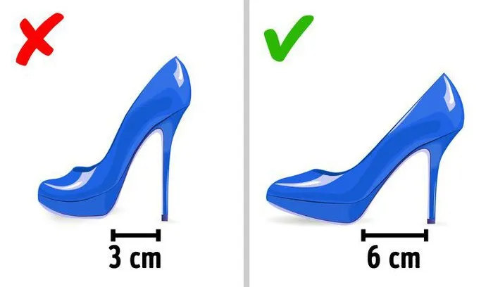 Một lưu ý khác để chọn giày thoải mái là chú ý đến khoảng cách giữa gót giày và đế. Gót giày càng cao thì khoảng cách sẽ càng ngắn. Khoảng cách 6 cm được coi là an toàn - nó làm cho chân đứng có độ ổn định tối đa.