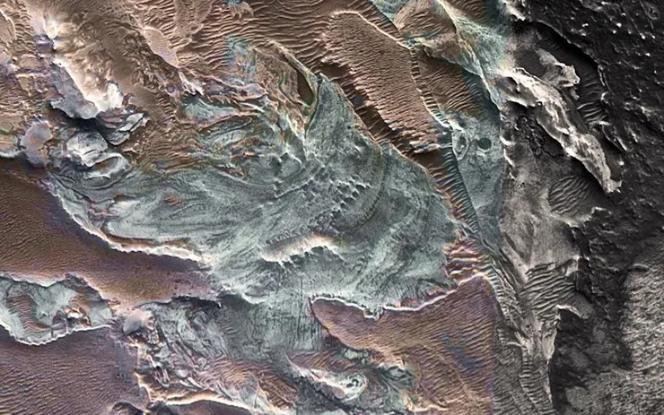 Các mỏ muối (màu xanh nhạt), nơi có khả năng tồn tại sông băng gần xích đạo sao Hỏa (Ảnh: ASA MRO HiRISE)