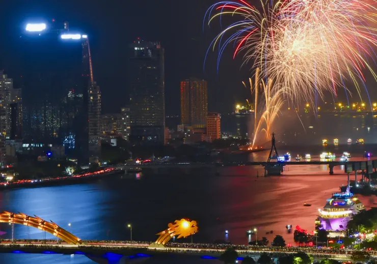 Pháo hoa bên cầu Rồng ở sông Hàn (Đà Nẵng) luôn thu hút du khách.