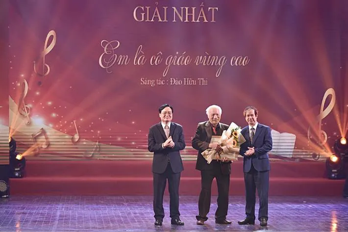 Bộ trưởng Bộ GDĐT Nguyễn Kim Sơn và Phó Trưởng Ban Tuyên giáo Trung ương Phùng Xuân Nhạ trao giải Nhất cho nhạc sĩ Đào Hữu Thi.