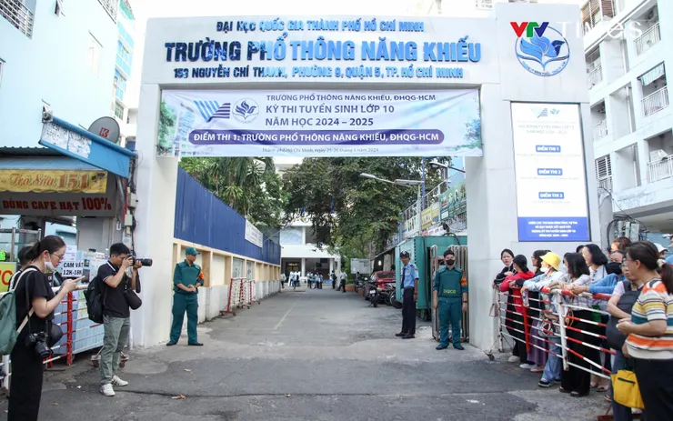 Tại điểm thi Trường Phổ thông Năng khiếu - Đại học Quốc gia TP Hồ Chí Minh, nhiều phụ huynh đưa con đến trường từ sớm rồi đứng đợi trước cổng. Ảnh: Minh Tân.