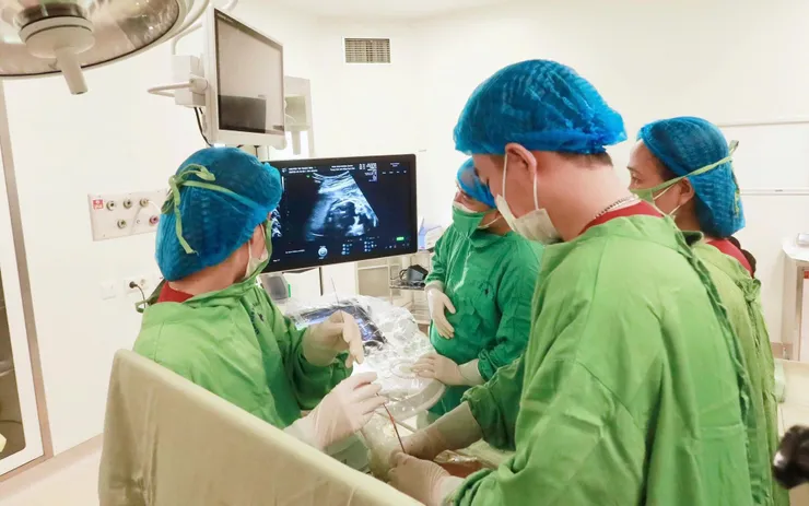 Sau hội chẩn, ekip thực hiện đặt shunt dẫn lưu dịch màng phổi dưới hướng dẫn siêu âm. Kim dẫn đường được đưa qua thành bụng mẹ, tiếp cận khoang màng phổi thai nhi, shunt được đặt giúp dẫn lưu dịch ra buồng ối, giảm áp lực và tạo điều kiện cho phổi giãn nở. Lượng nước ối dư cũng được hút bớt để đảm bảo tuần thai phù hợp.