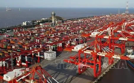 Hoạt động bốc xếp hàng hóa tại cảng ở Thượng Hải, Trung Quốc. Ảnh: THX/TTXVN