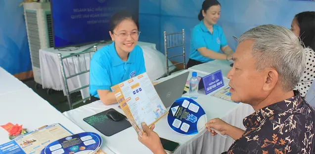 Tuyên truyền chính sách BHXH, nhận lương hưu, trợ cấp qua tài khoản tại Nam Định. Ảnh: TTXVN