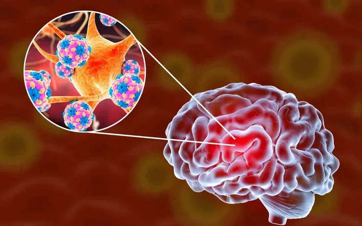 Người mắc có thể sốt cao, đau đầu, nôn, rối loạn ý thức, co giật và nhanh chóng rơi vào hôn mê. Tỷ lệ tử vong cao, khoảng 30-50% người sống sót để lại di chứng thần kinh lâu dài.