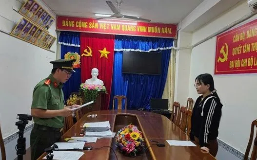 Cơ quan An ninh điều tra Công an tỉnh Cà Mau công bố quyết định khởi tố bị can, quyết định truy nã đối với Nguyễn Kim Xuyến về tội “Tổ chức cho người khác xuất cảnh trái phép”. Ảnh: CA
