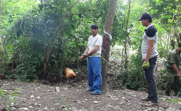 Đối tượng Bình thực nghiệm lại hành vi phạm tội tại hiện trường vụ án. (Ảnh: TTXVN)