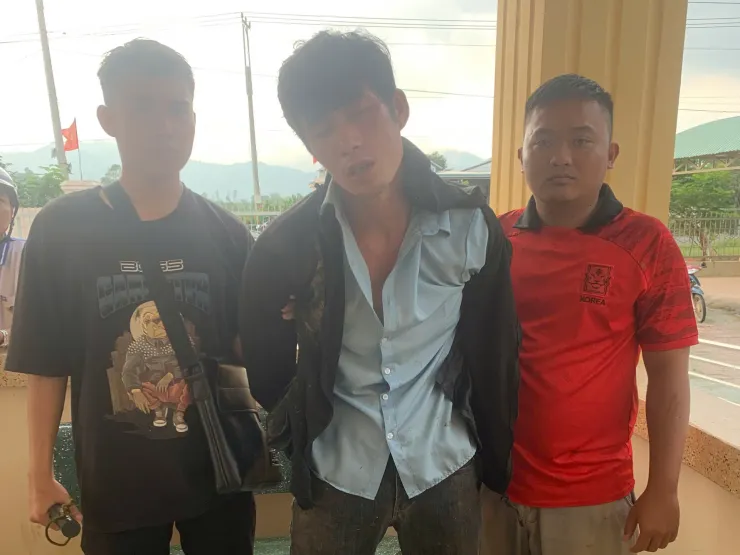 Công an huyện Hàm Tân khống chế 1 trong 3 đối tượng trộm cắp (giữa) về trụ sở làm rõ hành vi phạm tội. Ảnh: CA.
