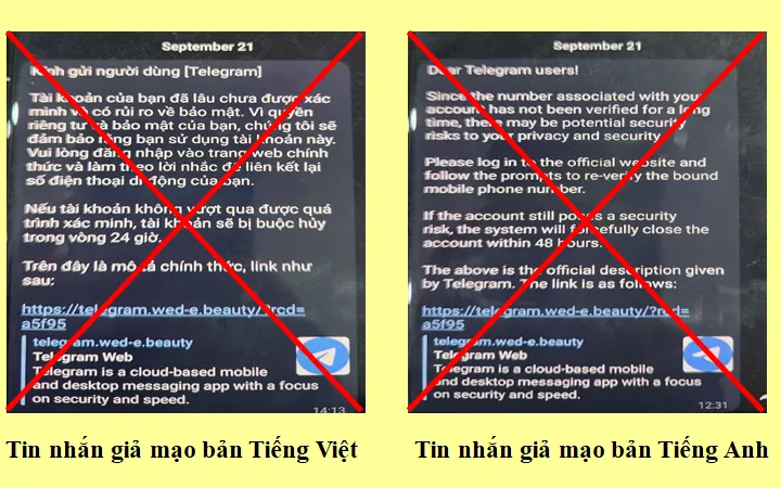 Thủ đoạn thường gặp là giả mạo tin nhắn của Telegram hoặc tài khoản do đối tượng chiếm đoạt được gửi thông báo yêu cầu click vào đường link do đối tượng cung cấp trên tin nhắn, nếu không tài khoản sẽ bị buộc hủy trong vòng 24 giờ - 48 giờ. Khi nạn nhân truy cập vào đường link sẽ phải cung cấp số điện thoại và quét mã QR code theo hướng dẫn của đối tượng. Các đối tượng tấn công dễ dàng đăng nhập vào tài khoản nạn nhân nếu tài khoản này không xác thực hai bước.