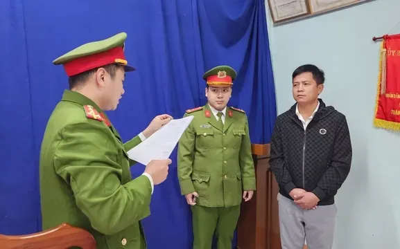 Cơ quan cảnh sát điều tra Công an tỉnh Quảng Trị đọc lệnh khởi tố, bắt tạm giam đối tượng Hoàng Công Thuận. Ảnh: NLD
