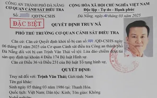 Ngày 10/3, Cơ quan Cảnh sát điều tra Công an TP Đà Nẵng phát lệnh truy nã đặc biệt đối với Trịnh Văn Thái (39 tuổi, quê Thanh Hóa; trú tại căn hộ ở chung cư Hoàng Anh Gia Lai, phường Thạc Gián, quận Thanh Khê, TP Đà Nẵng) về tội lừa đảo chiếm đoạt tài sản.