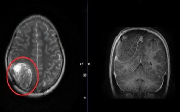 Thời gian gần đây, bệnh nhi xuất hiện triệu chứng đau đầu tái diễn, kèm khối u sưng vùng đầu. Kết quả chụp cộng hưởng từ cho thấy khối u vùng hố chẩm phải tái phát, kích thước khoảng 7,2 × 5 × 5 cm, có dấu hiệu xuất huyết trong u và xâm lấn xoang tĩnh mạch – khiến việc xử trí trở nên đặc biệt khó khăn.