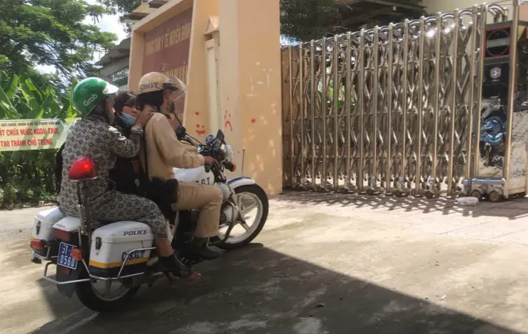 Chiến sĩ CSGT công an huyện Bình Chánh, TP Hồ Chí Minh chở người gặp nạn đi cấp cứu