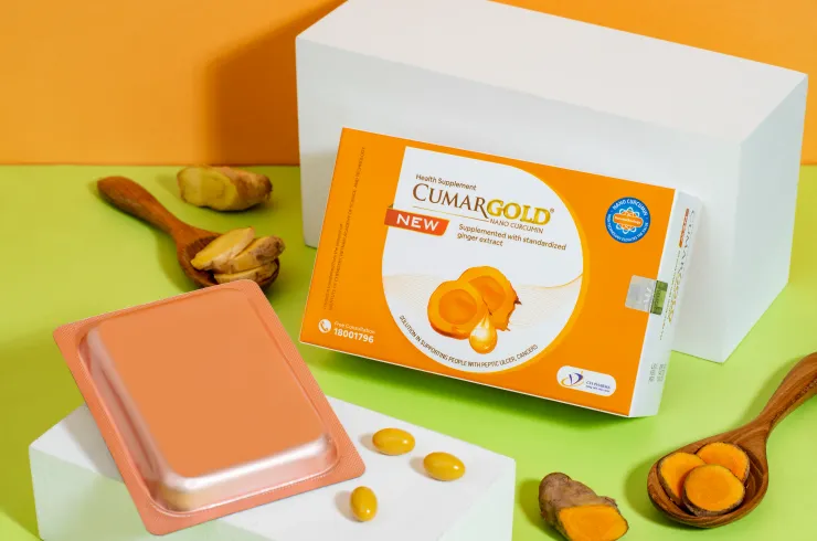 Điều này giúp nano curcumin trong CumarGold New hỗ trợ dạ dày nhanh hơn 40 lần curcumin hay tinh nghệ thông thường, có độ an toàn cao và không gây độc tính khi sử dụng (theo nghiên cứu của Học viện Quân Y). Đặc biệt, khi được kết hợp với chiết xuất gừng chuẩn hóa, thành phần này càng được phát huy công dụng cao hơn đối với các trường hợp viêm loét dạ dày hoặc trào ngược thực quản.