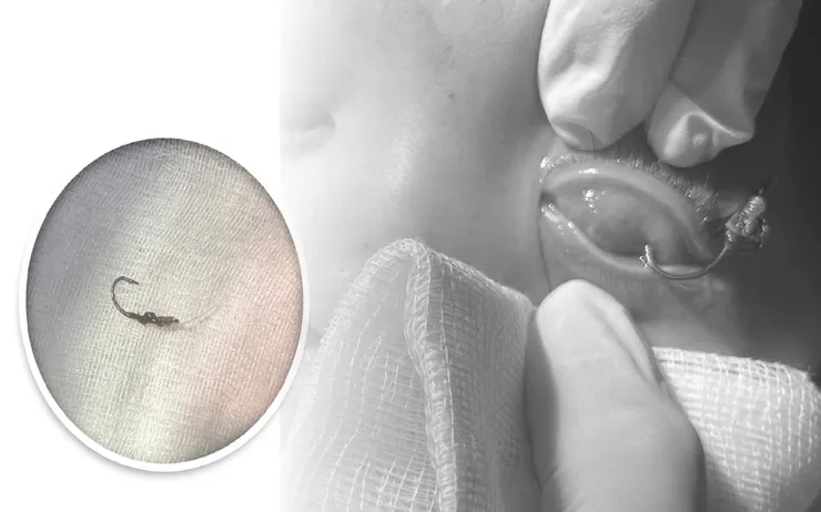 Theo lời kể của gia đình, cách vào viện khoảng 1 tiếng, bệnh nhi đi câu cá thì bị lưỡi câu móc vào mắt.