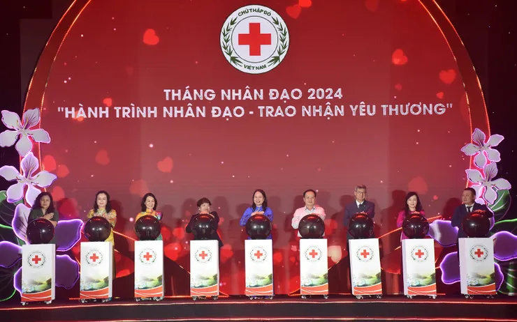 Quyền Chủ tịch nước Võ Thị Ánh Xuân cùng các đại biểu bấm nút phát động Tháng Nhân đạo cấp Quốc gia năm 2024.