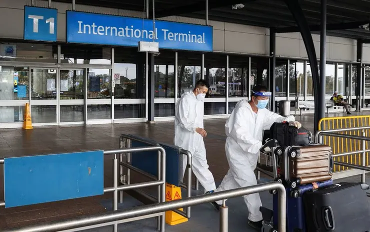 Hành khách trong trang bị bảo hộ cá nhân rời nhà ga quốc tế để đón taxi tại sân bay Sydney, Australia. (Ảnh minh họa: Reuters)