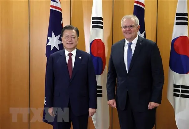 Thủ tướng Australia Scott Morrison (phải) và Tổng thống Hàn Quốc Moon Jae-in tại cuộc hội đàm ở Canberra ngày 13/12/2021. (Ảnh: Yonhap/TTXVN)