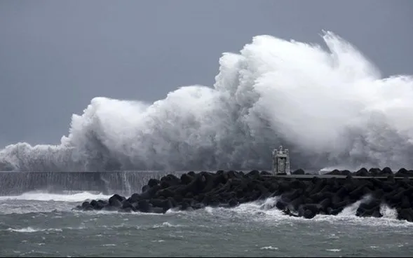 Những đợt sóng cực cao đập vào đê chắn sóng ở cảng Udono (tỉnh Mie, Nhật Bản) vào chiều 14/8. (Ảnh: The Yomiuri Shimbun)