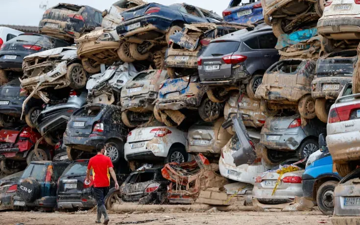 Xe chất đống sau trận lũ lụt nghiêm trọng ở thành phố Paiporta, vùng Valencia của Tây Ban Nha (Ảnh: EPA)