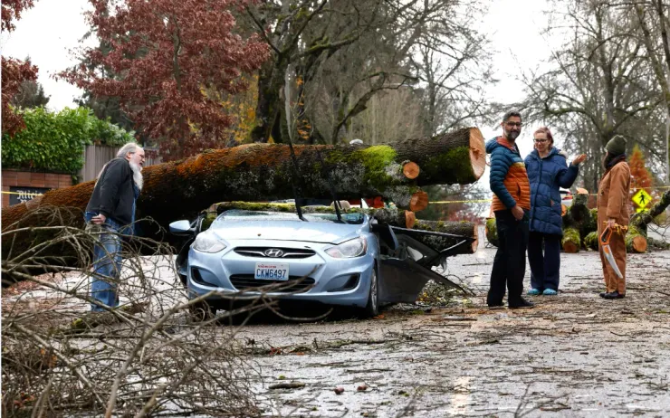 Ô tô bị cây đổ đè lên sau cơn "bão bom" trên Đại lộ 35 Đông Bắ,c tại Seattle, ngày 20/11 (Ảnh: AP)