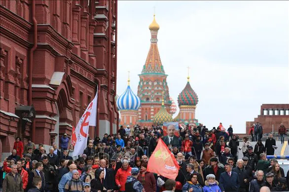 Các đại biểu đi dâng hoa tưởng nhớ Lãnh tụ Lenin ở Quảng trường Đỏ ngày 22/4 - Ảnh: TTXVN