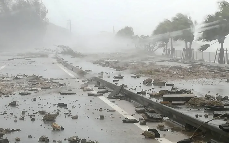 Những con sóng lớn tràn qua con đường dẫn đến đền Aoshima ở thành phố Miyazakingày 9/8. (Ảnh: The Japan News)