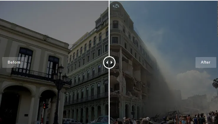Khách sạn Saratoga trước và sau vụ nổ. (Ảnh: CNN)