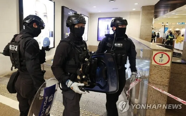 Cảnh sát tại hiện trường vụ đâm dao ngay một cửa hàng bách hóa gần ga Seohyeon ở Seongnam, phía nam Seoul, ngày 3/8 - Ảnh: Yonhap