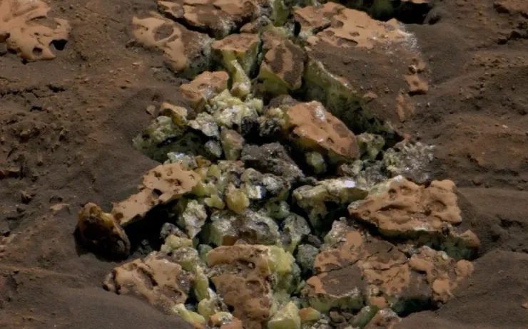 Mọi chuyện bắt đầu khi xe tự hành Curiosity của NASA đụng phải một hòn đá trên sao Hỏa ngày 30/5 vừa qua và làm nó nứt ra, để lộ những tinh thể màu xanh lục vàng chưa từng được phát hiện trước đây trên hành tinh đỏ.