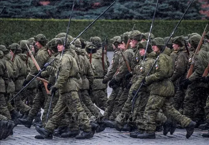 Binh sĩ Nga tại Quảng trường Đỏ ở thủ đô Moscow (Ảnh: AFP/TTXVN)