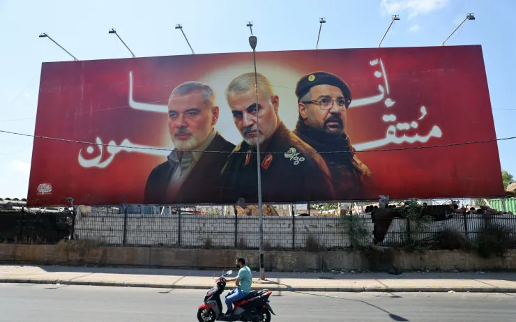 Hình ảnh các nhà lãnh đạo bị ám sát: Ismail Haniyeh của Hamas, chỉ huy Lực lượng Quds Iran Qasem Soleimani (giữa) và chỉ huy cấp cao của Hezbollah Fuad Shukr gần sân bay quốc tế Beirut, ngày 3/8 (Ảnh: AFP)