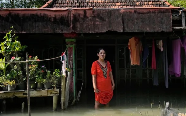 Không ngày nào là bà Kasmini không quét nước đọng ra khỏi nhà, nhưng khi thủy triều dâng, nhà của bà lại ngập bì bõm. Tình trạng ngập lụt do nước biển dâng đang ngày càng phổ biến ở làng Timbulsloko nói riêng và bờ biển phía Bắc của tỉnh Trung Java nói chung. Bà Kasmini cho biết, mực nước biển dâng cao nhất có thể lên đến ngang người. Con gái của bà, chị Dwi Ulfani, không thể nhớ được thời điểm mà ngôi nhà không bị ngập lụt là khi nào.