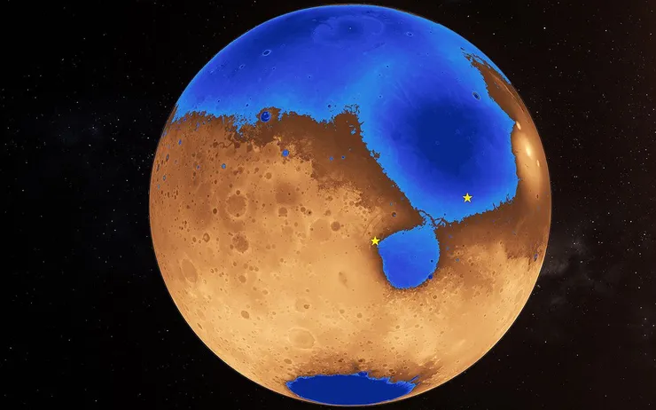 Hình ảnh giả định về sao Hỏa cách đây 3,6 tỷ năm với đại dương Deuteronilus bao phủ một nửa hành tinh. (Ảnh: Robert Citron)